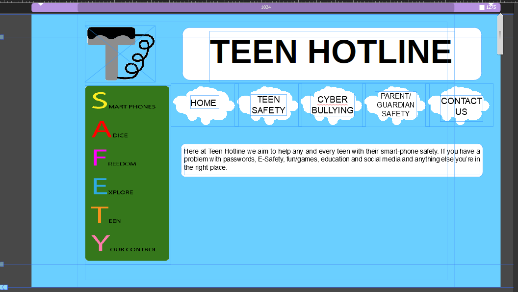 I honestly had no idea what to do on Muse but thankfully VJ was on hand to help me with everything which I am very thankful, he would teach me how to do something once and then let me action that onto my Muse document. Slowly slowly I moved everything over from Illustrator into Muse and the website was coming together very well. I created everything for our website 'uniform' and basic layout which would appear on every page on the home page and hyperlinked it all to the correct pages on the website. These hyperlinks included the navigation buttons to their intended pages, the logo to the home page and the headline 'TEEN HOTLINE' to the home page. Once I had done that I copied the whole page, pasted it in place on the other 4 pages and named the other 4 pages the intended names for their page. This made my life so much easier as it was practically half the work on the website done as all that needs to be done on the website now is individual content for each page.