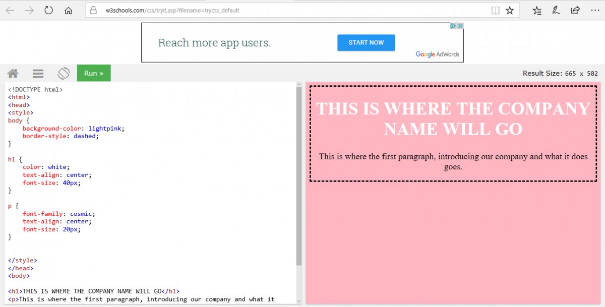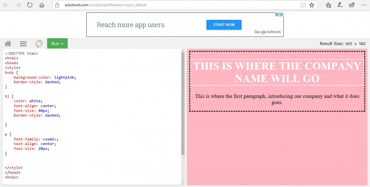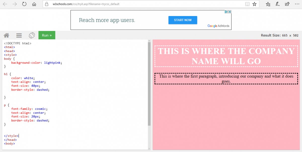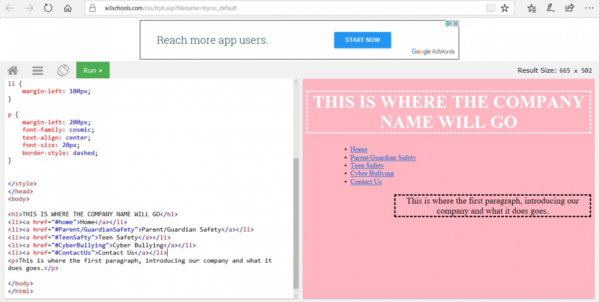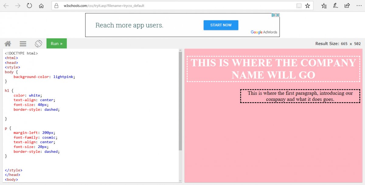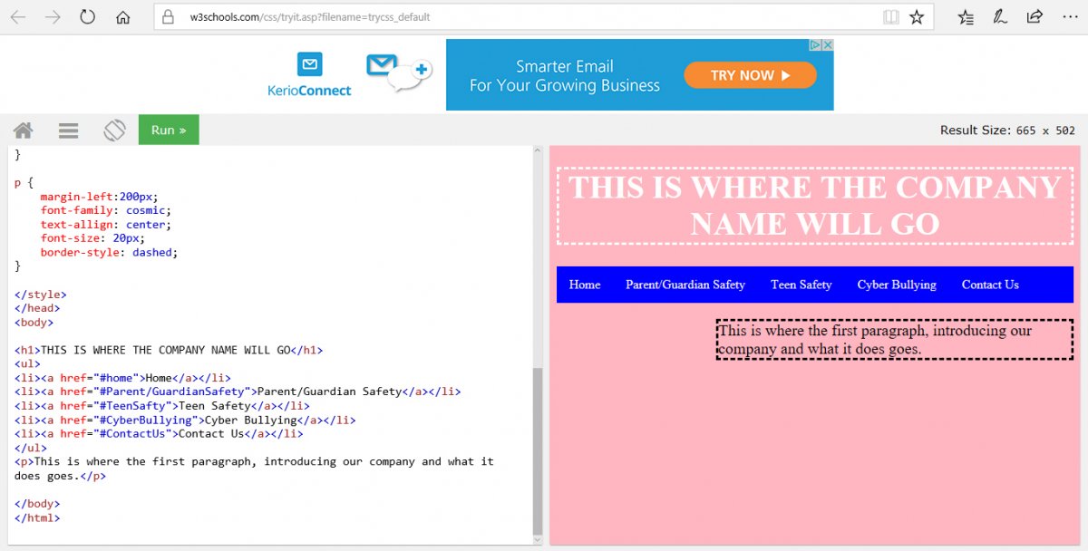 In this step I was able to put a dotted outline on the paragraph text box rather than it being around the headline and the paragraph box. I find this rather easy as with coding its all about the placing of the code to create what you want, where you want it. It's all about understanding where to place the code I get a bit confused about but I keep playing around and seeing where it might go to see if I am correct.