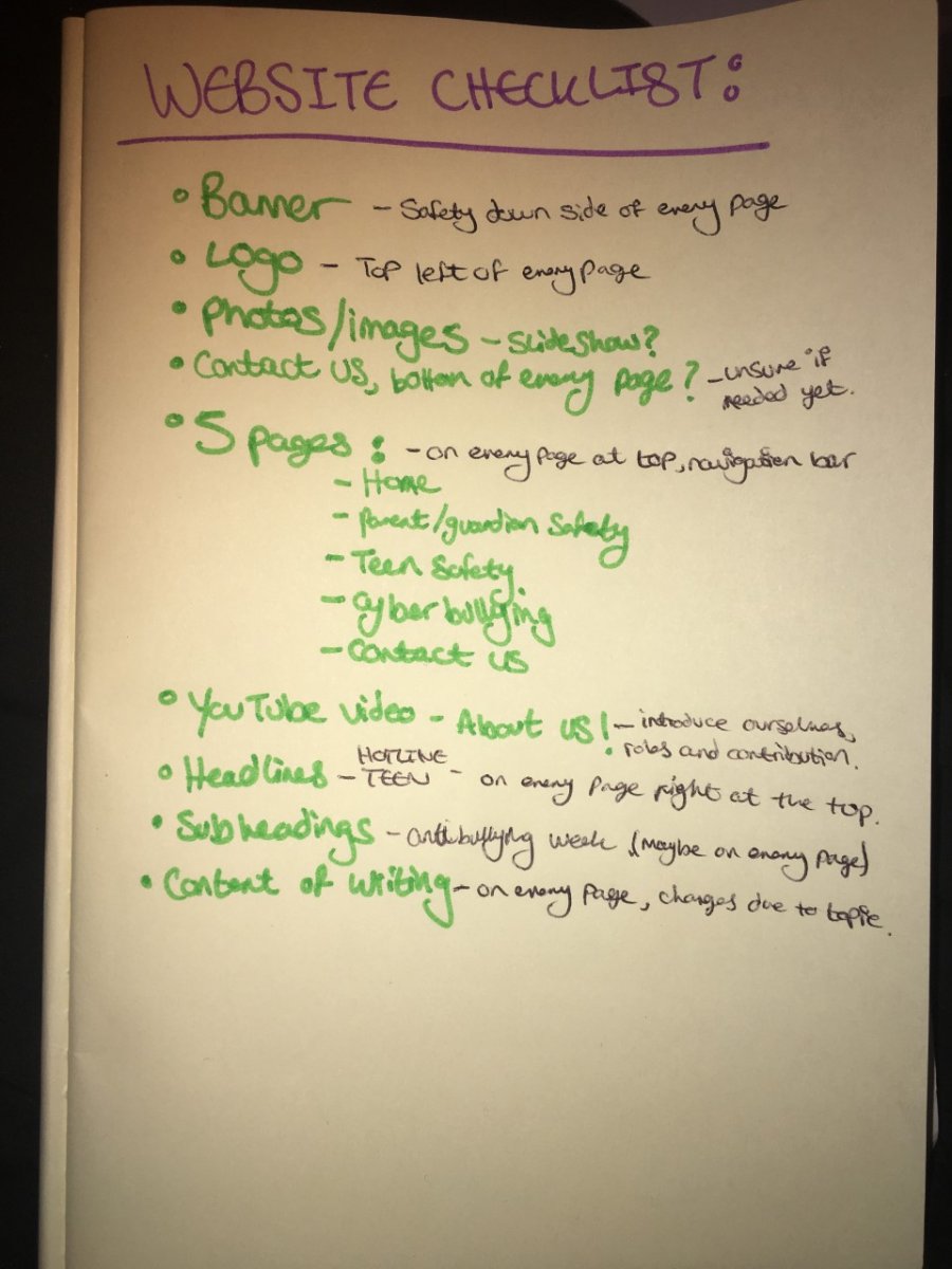I also created a checklist of things we need to do for our website and what should be included within each web page as well as a level 1 wireframe for our website. Both of these are on paper as I like to put my thoughts and initial designs on paper and go from there on a computer as I have the first stage of my work next to me on paper as I am developing and going further on the computer.