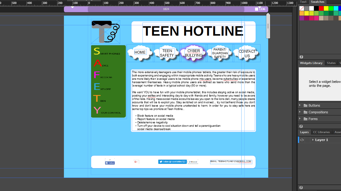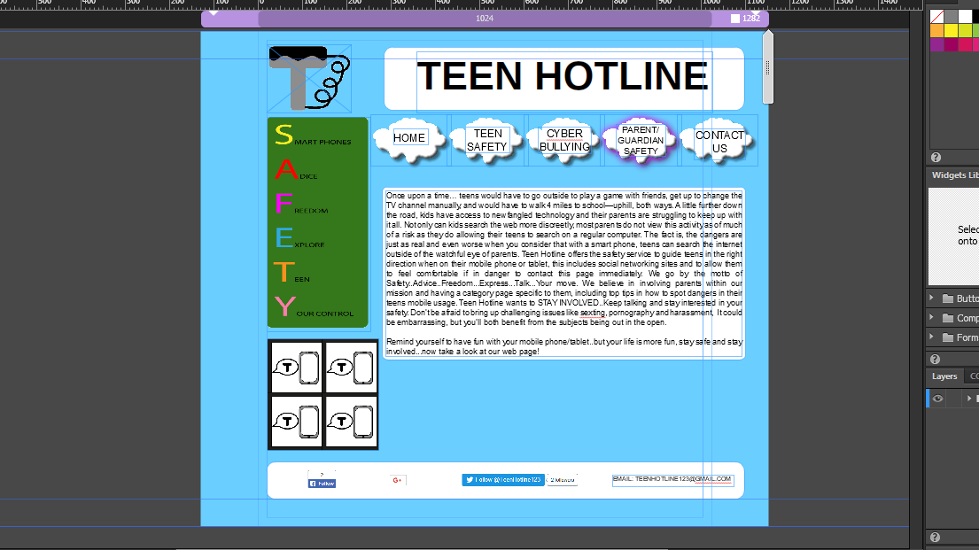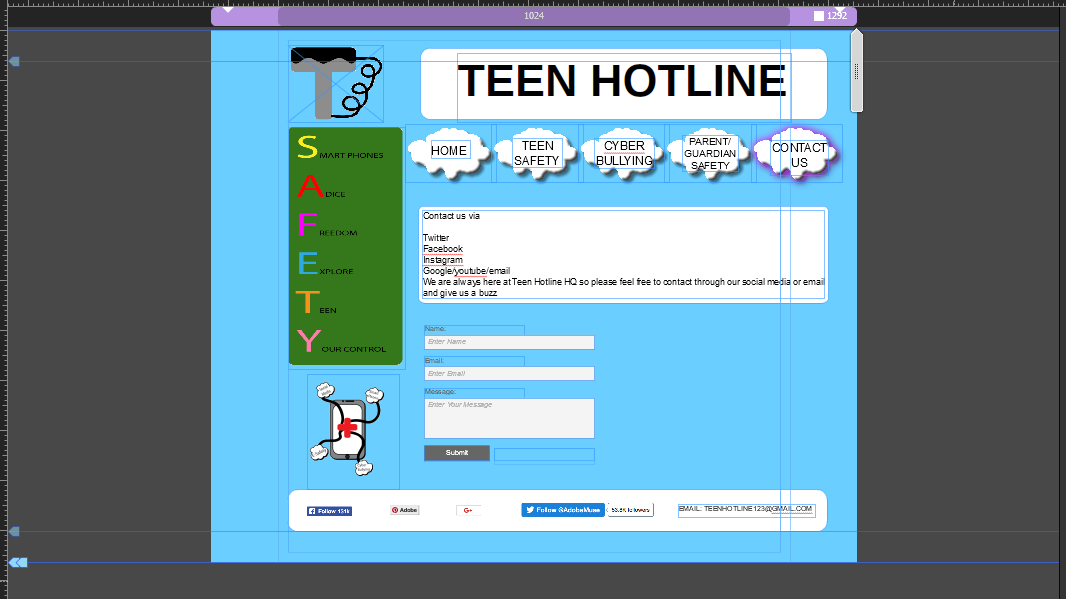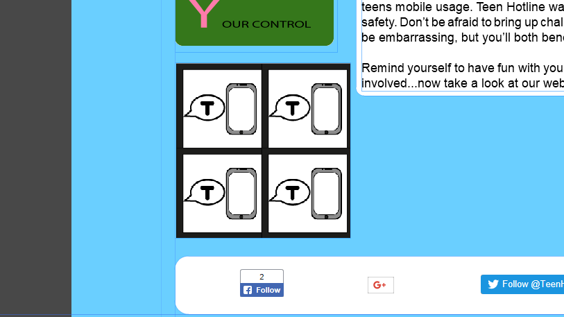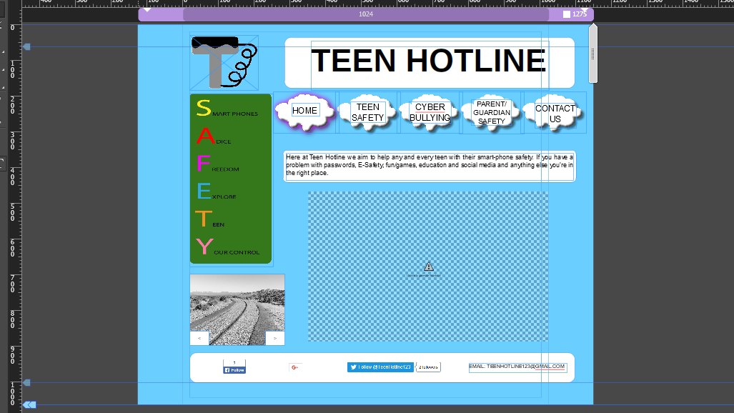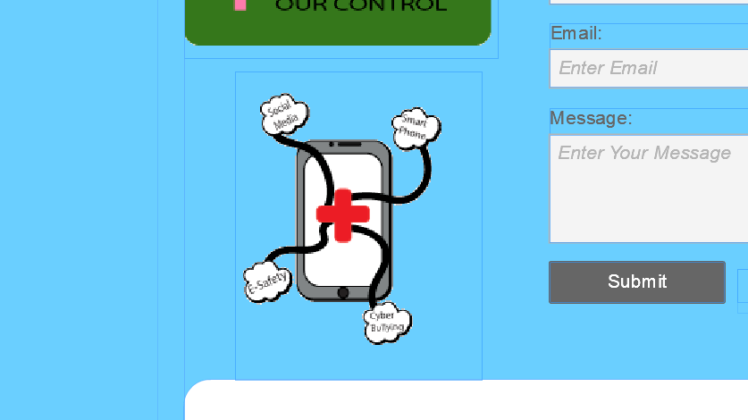 As I have mentioned in previous week's work I took the 'unsuccessful' logos and created website graphics for them to fill the page with something else as having a lot of blank spaces doesn't look good or professional. I have used one of the developed logo design (logo 2) and inserted it into the 'Parent/Guardian Safety' as it works well on that page due to the message being someone talking about a smartphone. I didn't add any colour to this graphic as there is a lot of colour going into each page which wouldn't work if more colour were to be thrown on the page, this is why the monochrome design is still in place. However, this graphic may be moved onto the 'Cyber Bullying' page as I'm not a big fan of the extra 2 website graphics being on the last 2 webpages like they have been dumped there. To get around this I will probably move the graphic onto the 'Cyber Bullying' page and insert another slideshow onto the 'Parent/Guardian Safety' page instead to create a bit more diversity as the user flows from page to page.