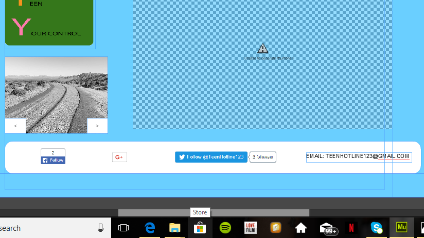 Firstly, I have added a little white banner to each and every webpage. This little banner has some icons on them, they're actually for our social media pages and email address as we both thought it was important to have these displayed on every page at the bottom in addition to the contact us page. This is an incredibly popular in any and every website as it adds more information to a webpage but also finishes the page off at the bottom which allows the audience to always know when they're at the bottom of the page. On the little white banner (which follows the colour co-ordination of white background and a rounded cornered rectangle that all of our website now uses and is part of our 'uniform') we have 3 icons and our email address, these icons are linked to our Facebook, Twitter and google account. I wanted to add Instagram but Muse doesn't have one for that and I couldn't find one of them little 'follow us on Instagram' type button on google images which was licence free. At the end of the banner we have our email address, ideally I wanted to create this as a link which takes you to an email page but I honestly couldn't figure out how to do that and wasted a good 30 minuets attempting to do this. Rather than wasting more time I am just going to move on.