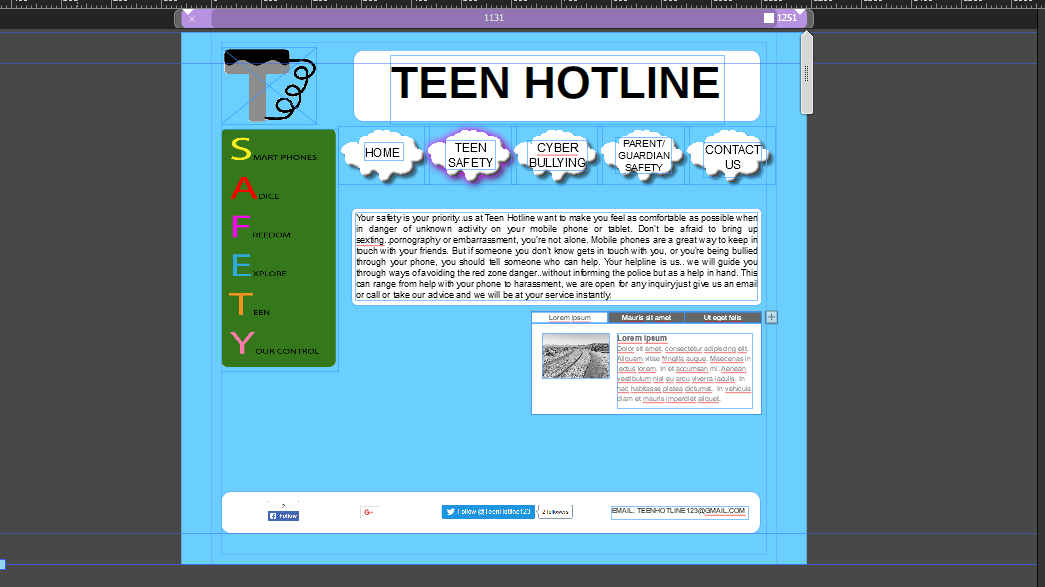 The navigation bar has been developed a lot more since last week and has taken some time to get to where it is now. I noticed it was interactive but it didn't do anything when you were on a specific page (meaning you can't easily identify what page you're currently on). What I did here was create a outer glow on the button for the current page to allow the use to quickly become aware of the page they're on. The colour purple is suitable because it is bold but not too in your face which I found using pink, yellow and orange all were. The purple colour is also the same purple used in our 'SAFETY' banner as I don't particularly want to create a new colour pallet due to our website containing many colours already. In addition to this change to the navigation bar, I have given each button a slight shadow as well as bevelled them to give them a 3D effect which allows them to stand out from the background becoming a focal point for the website. Me and Kate both agreed that the navigation bar is one of the most important aspects of our website so I have spent a lot of time on this. A final addition I have made to this navigation bar is a rollover action on all the pages which aren't the current webpage. This rollover is a red glow on the outside of the cloud when the curser of the mouse rolls over the button. This gives our navigation bar direction, effectiveness, appeals to our target audience (kids/teens) as they really like things which are interactive and it looks professional. I used the colour Red because it is a colour which really stands out, contrasts against the blue background and is incorporated within the 'SAFETY' banner. The only problem which has occurred during the development of the navigation bar is when you rollover the text on the button the red glow on the cloud disappears. I have spent lots of time attempting to fix this, googled the issue and looked through the Adobe Muse help website but I simply cannot find a solution to my problem. This means I will have to change the navigation bar in some way to fix this issue. I wont do that just yet as I will do this once me and Kate have decided on fonts for our website to see if I can maybe do something with highlighting the text on the button when it is rolled over rather than the button itself potentially but we will see.