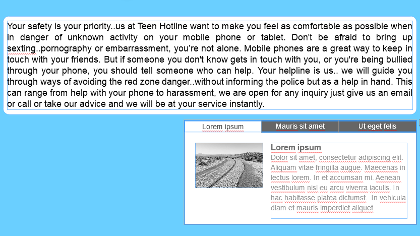 When filling out the content (provided by Kate) on the website, VJ informed me that it was a little heavy and that I should split it up into smaller paragraphs as our target audience will not read a big chunk of writing so to get around this I found a widget called 'Tabbed Panels' which has a three tab system, allowing the text to be broken up easily and effectively. I have messaged Kate and asked her create more content but for it to be split up three ways to fit into the tabbed panel. The content needs to be changed for all the pages except the 'Home' page as there is too much content on each one. The Contact us page doesn't have too much content but too little and I think it would be nice and 'uniform' to have the tabbed panel on all on the pages after the home page. This is another interactive feature for the website too to keep things changing on our website and keeping the target audience engaged in our site as well as getting our educational meaning across to them.